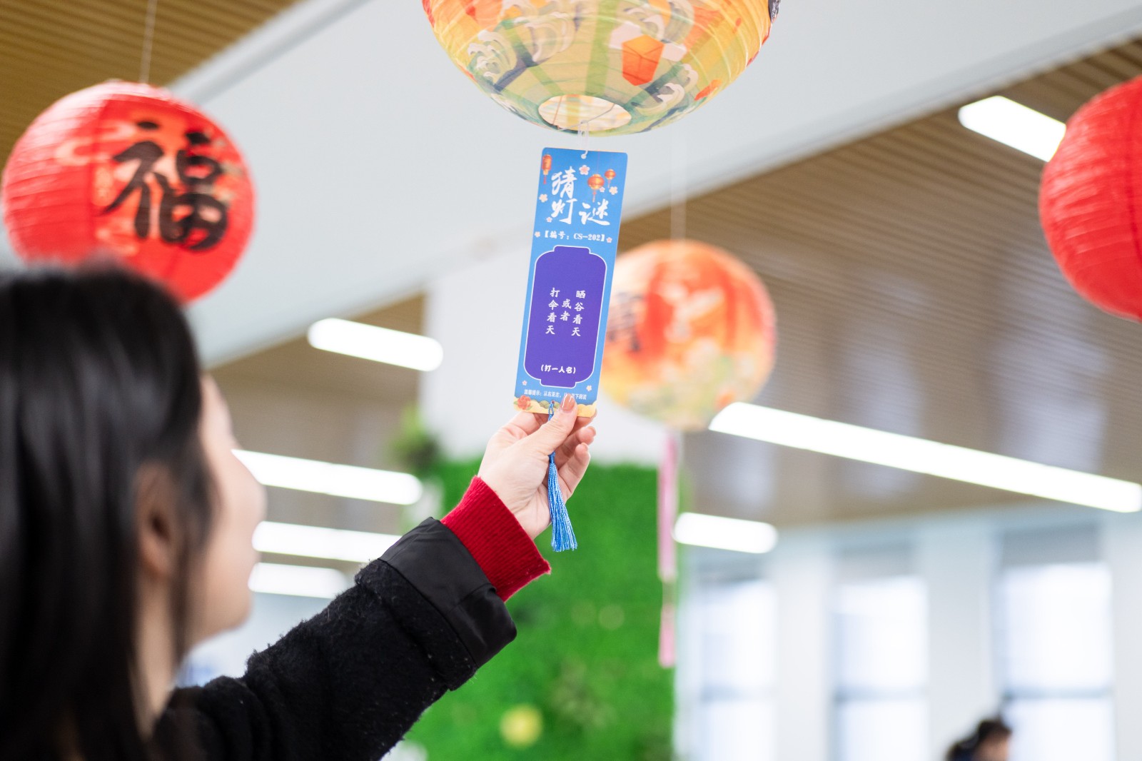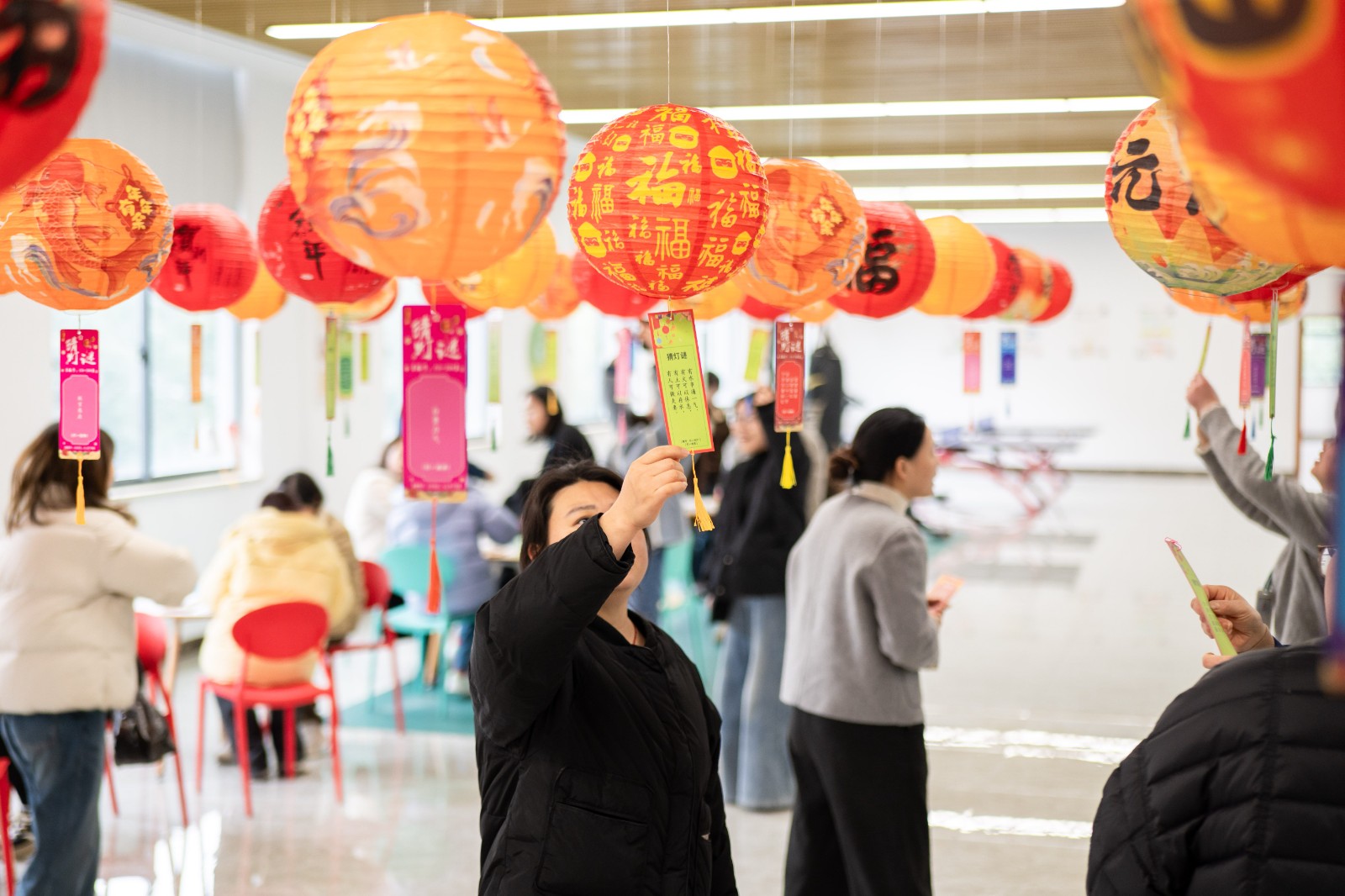 活動(dòng)現(xiàn)場(chǎng),紅彤彤的燈籠高高懸掛,綴滿園區(qū),福氣漫溢各處。作為上元佳節(jié)流傳千年的傳統(tǒng)雅趣,燈謎自古便有“文義隱語(yǔ)”之稱,是文人雅士借字傳情的智慧游戲。
