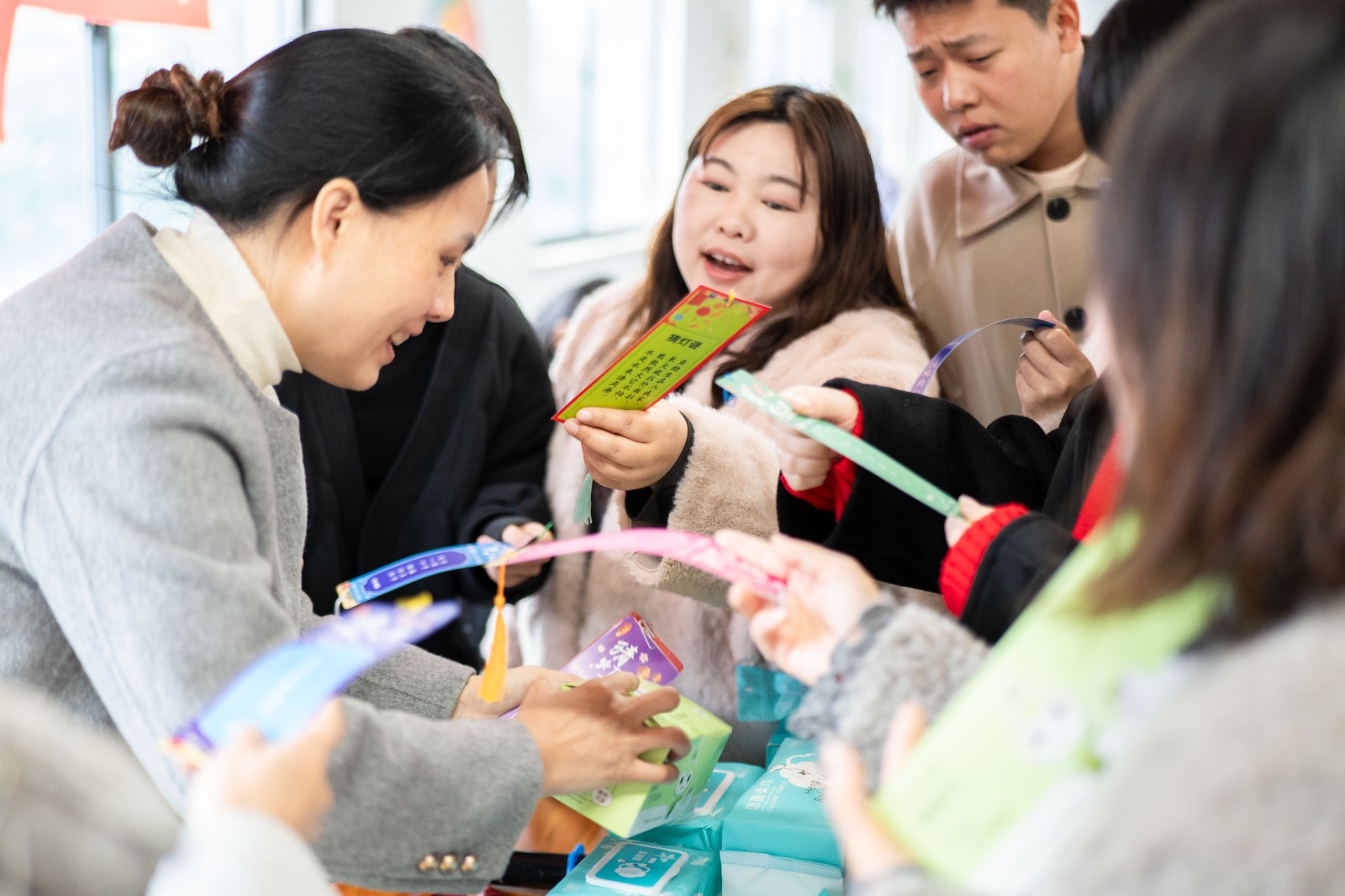 此刻,燈籠下懸掛的紅色謎面正延續(xù)著這份千年浪漫。一張張紅色謎面下既有考驗(yàn)功底的經(jīng)典字謎,也有貼近生活的“燒腦題”。每當(dāng)謎底揭曉,周圍便引來(lái)一陣恍然大悟的歡笑,輕松又熱鬧。