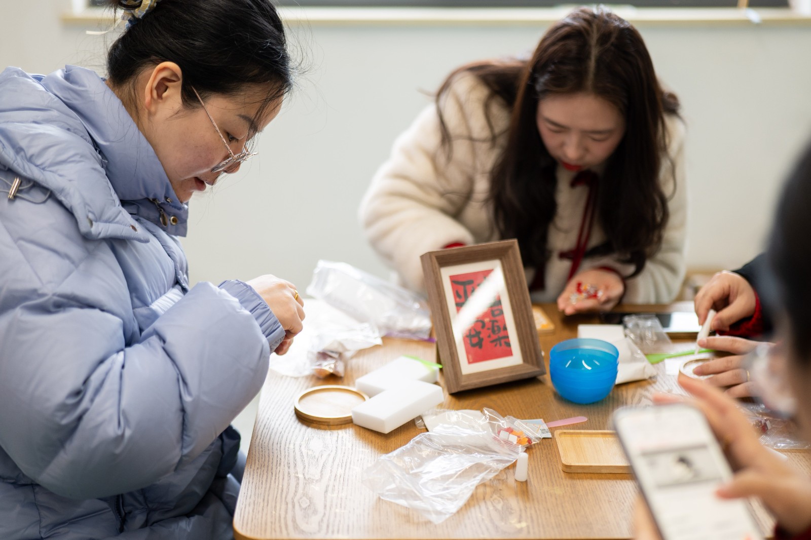 在福字杯墊DIY區(qū),大家紛紛化身手工達(dá)人,沉浸在創(chuàng)作的樂(lè)趣中。涂膠、粘貼、填縫……看似簡(jiǎn)單的步驟,卻需要十足的耐心。10分鐘后,一個(gè)個(gè)精美的福字杯墊在手中成型。捧著自己親手完成的作品,小伙伴們的笑意里滿是藏不住的小小成就感。